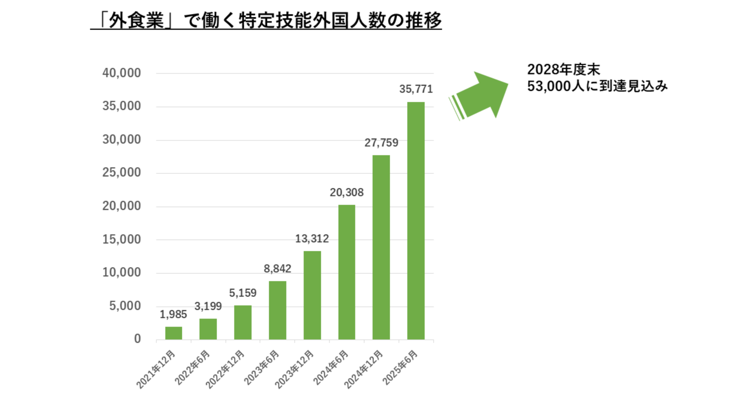特定技能「外食業」は今後最も伸び率が大きいとされている分野のひとつです。2025年6月時点で35,771人の特定技能外国人が就業しており、政府方針では2028年度末までに53,000人の受入れを見込んでいることが発表されています。