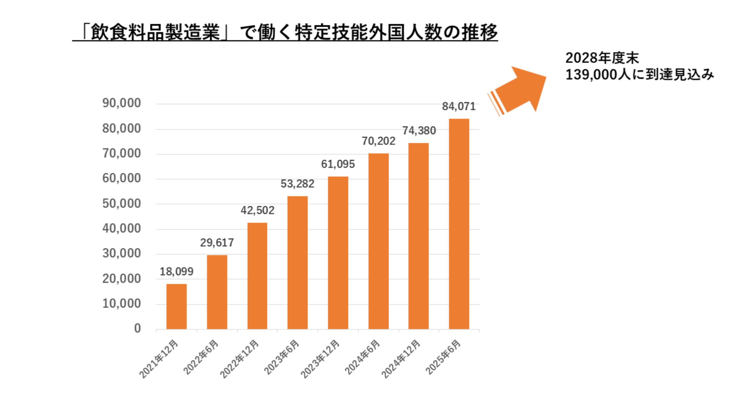 2025年6月時点で84,071人の特定技能外国人が就業しており、政府方針では2028年末までに139,000人の受入れを見込むことが発表されています。
